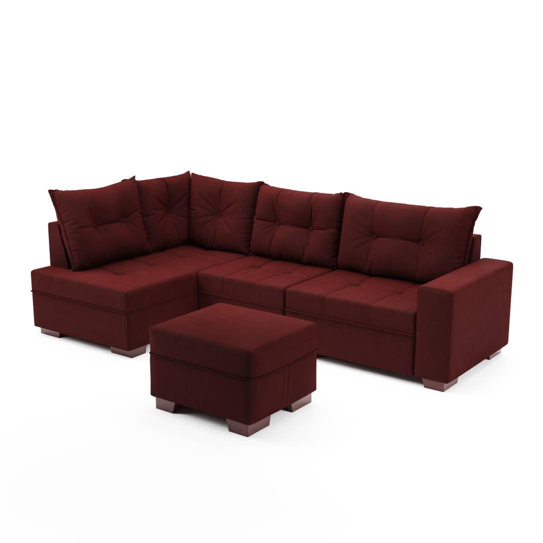 Sofá de canto modulado com 1 chaise, 1 peça de 1 lugar, 1 peça de dois lugares e 1 PUFF – Madeira de eucalipto e pinnus, percinta elástica – Espuma D23 – Almofadas soltas com enchimento em fibra e flocos – Pés de plástico na cor tabaco.